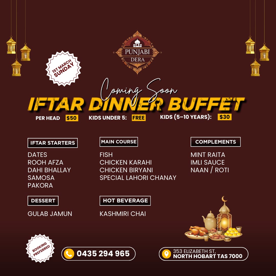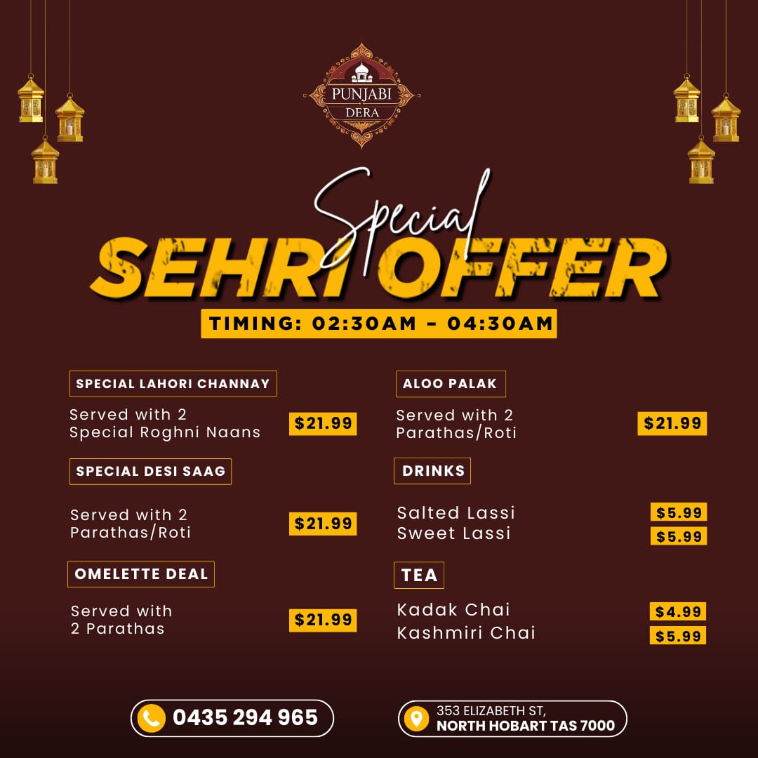 ✦ Ramadan Sharif ✦ Sehri & Iftari ORDER NOW ✦ Ramadan Timing ✦ DAY Monday Tuesday Wednesday Thursday Friday Saturday Sunday SEHRI 2:30 - 4:30am 2:30 - 4:30am 2:30 - 4:30am 2:30 - 4:30am 2:30 - 4:30am 2:30 - 4:30am 2:30 - 4:30am IFTARI 5:00 - 11:00pm 5:00 - 11:00pm 5:00 - 11:00pm 5:00 - 11:00pm 5:00 - 11:00pm 5:00 - 11:00pm 5:00 - 11:00pm